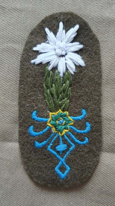 Naszywka Szkoły Wysokogórskiej, haftowane, na suknie w kolorze khaki - sukno mundurowe. Dostępna również wersja na suknie bordowym.