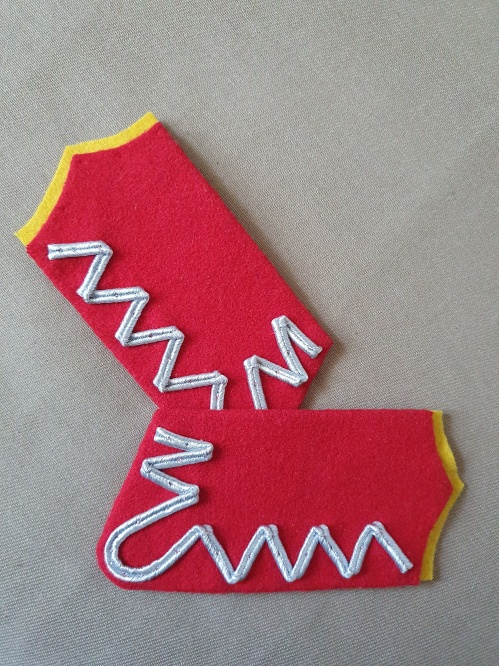 Patki szeregowych żandarmerii wz.19, jeden ze wzorów używanych w okresie międzywojennym, wykonane ze szkarłatnego sukna z żółtą wypustką obszyte srebrnym galonem.